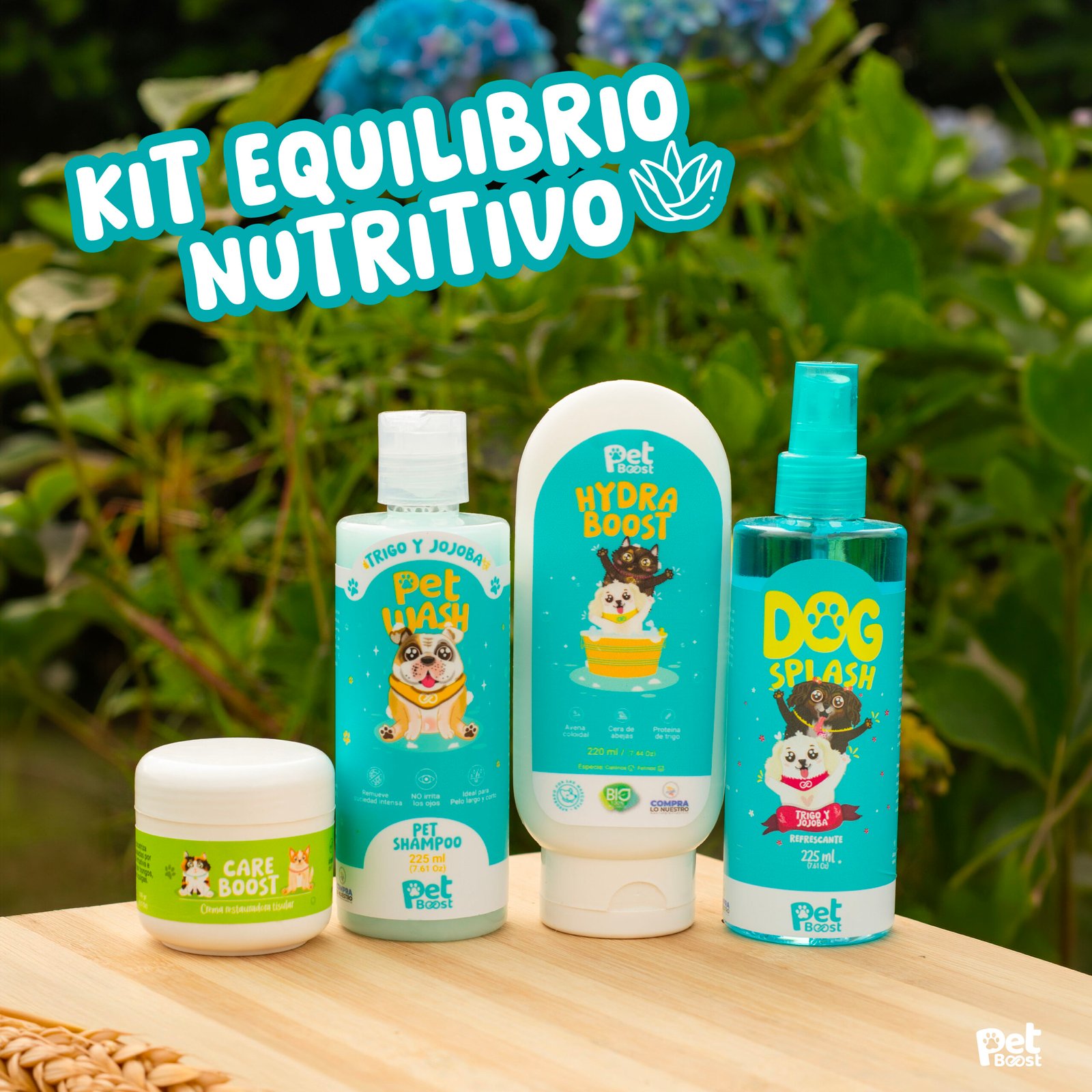 El kit Equilibrio Nutritivo está diseñado para brindar hidratación intensa, nutrición y protección en una rutina completa de cuidado. Incluye el Pet Wash Trigo y Jojoba, el HydraBoost, el Dog Splash Trigo y Jojoba y la Crema CareBoost, una combinación ideal para fortalecer el pelaje y mantener la piel equilibrada y saludable.